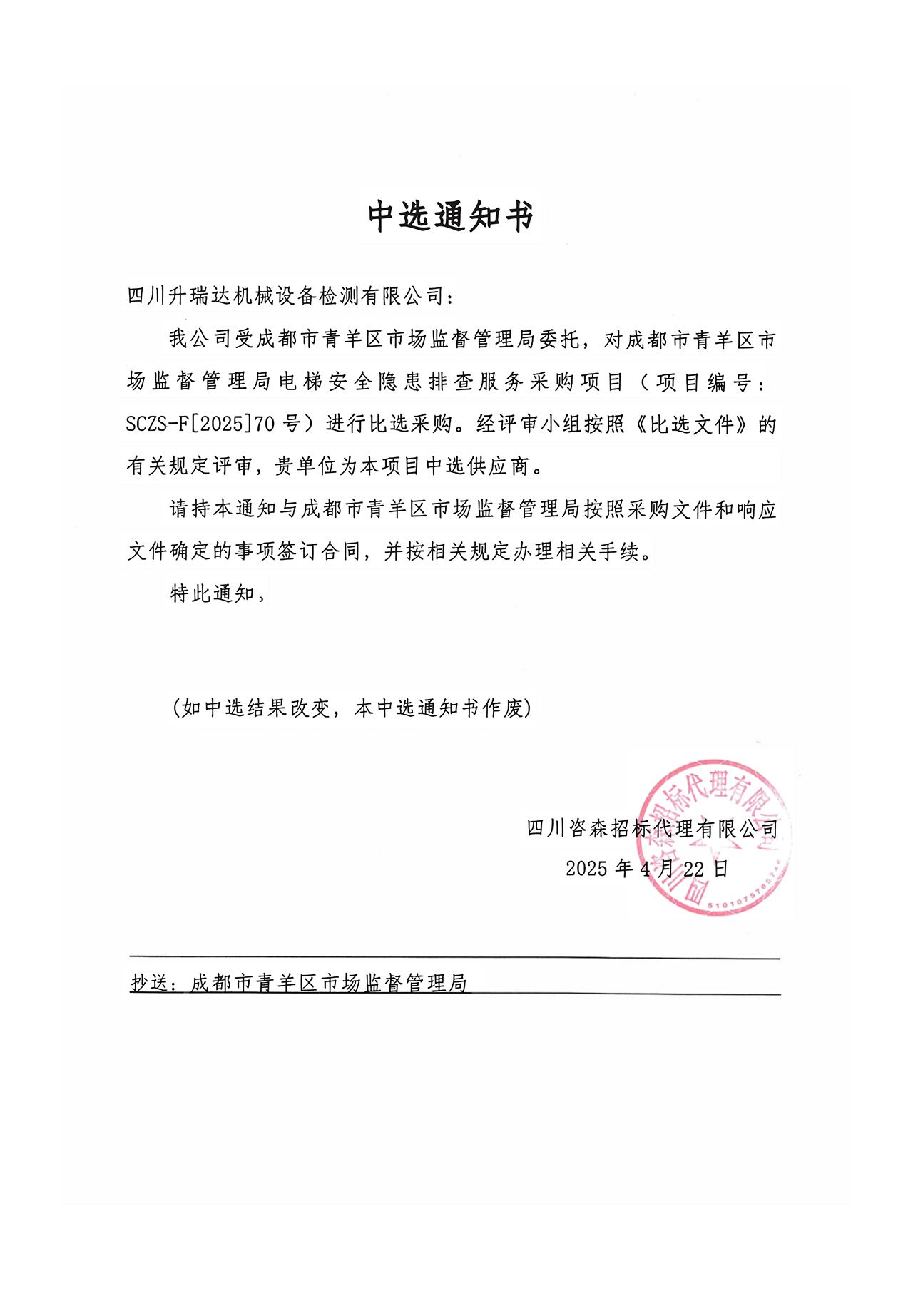 近日,四川升瑞達(dá)機(jī)械設(shè)備檢測有限公司在青羊區(qū)電梯安全隱患排查服務(wù)項(xiàng)目的激烈競標(biāo)中脫穎而出,成功斬獲中標(biāo)資格。這一成果不僅是對(duì)公司專業(yè)實(shí)力的有力佐證,更為其在電梯檢測領(lǐng)域的深度拓展注入強(qiáng)大動(dòng)能。